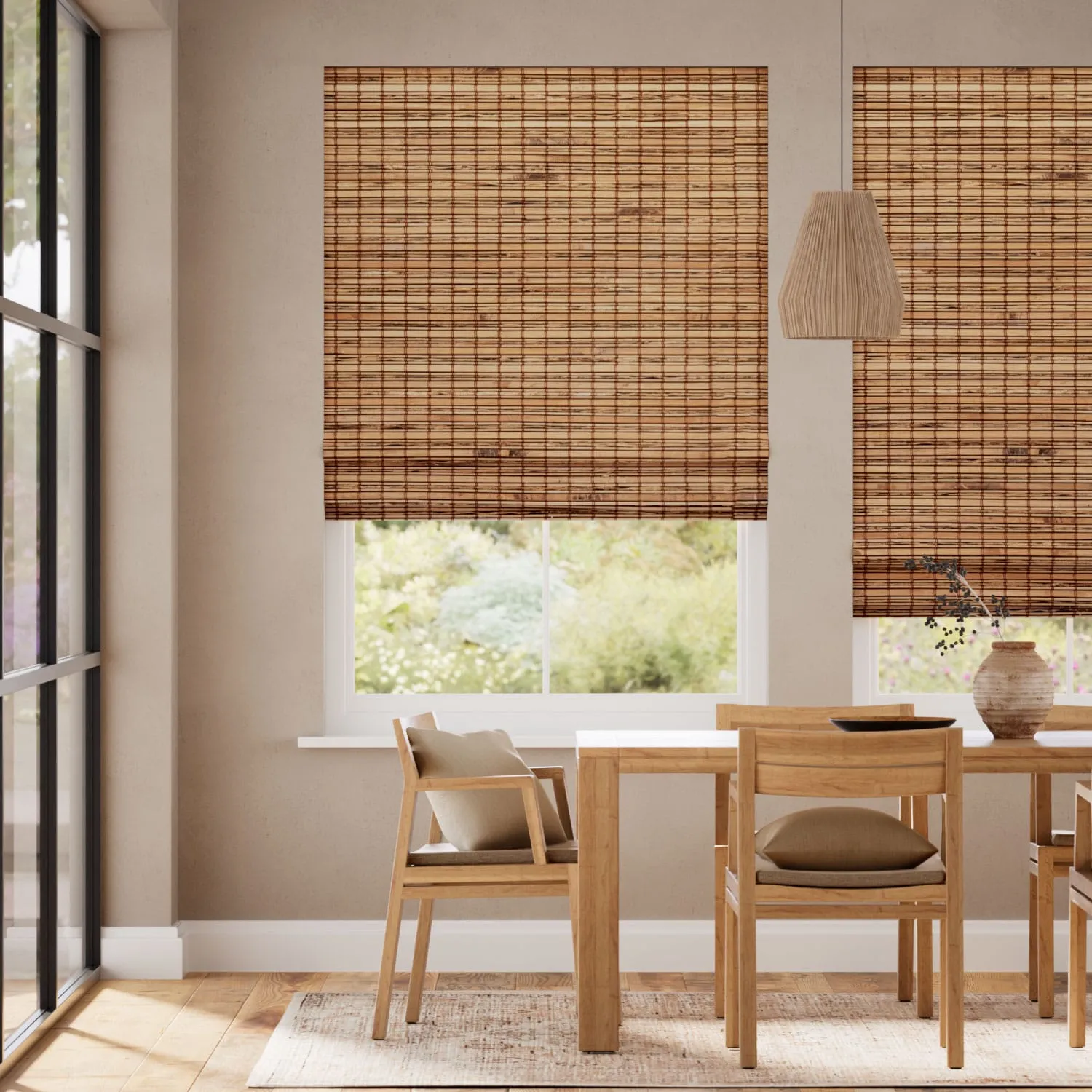 Warm bamboo blinds in a sandy tone with elegant vertical stitching and classic Roman folds. Blackout lining enhances privacy and light control while adding natural depth and texture to your windows.