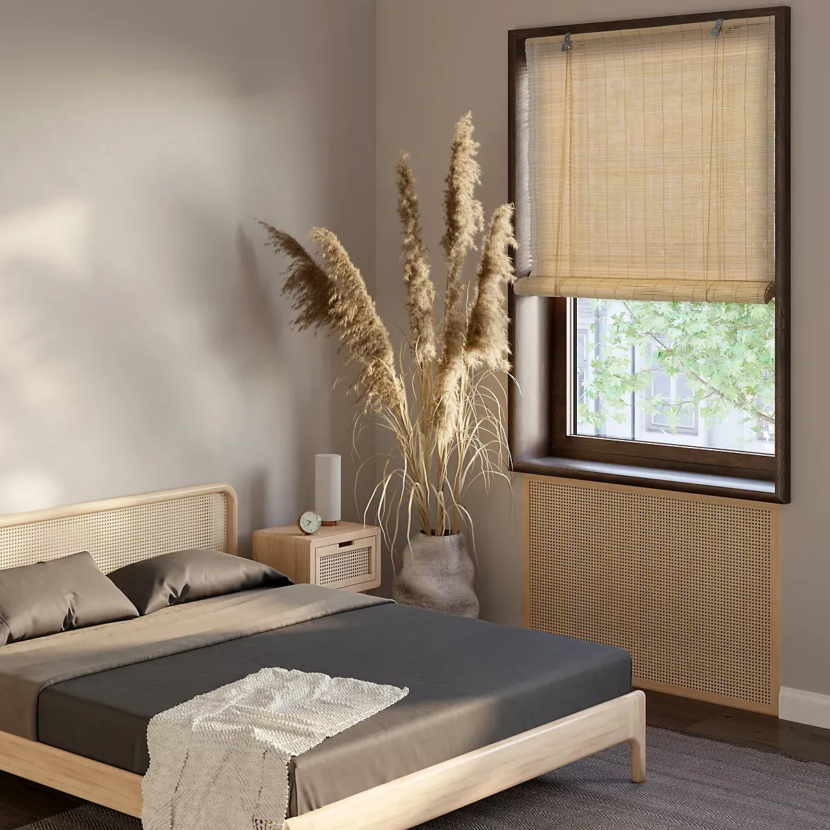 Natural bamboo blinds with a smooth roller design that gently dims daylight while maintaining a warm and inviting atmosphere. Provides added privacy with an organic texture, making it ideal for comfortable living spaces.