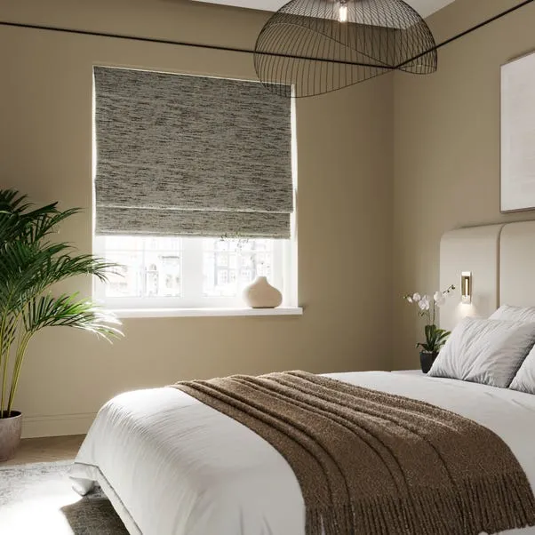 Textured Roman blackout blind with 100% recycled polyester fabric. Provides full light-blocking, privacy, and a soft, elegant look, ideal for bedrooms or living rooms with easy installation.