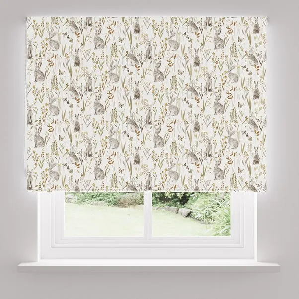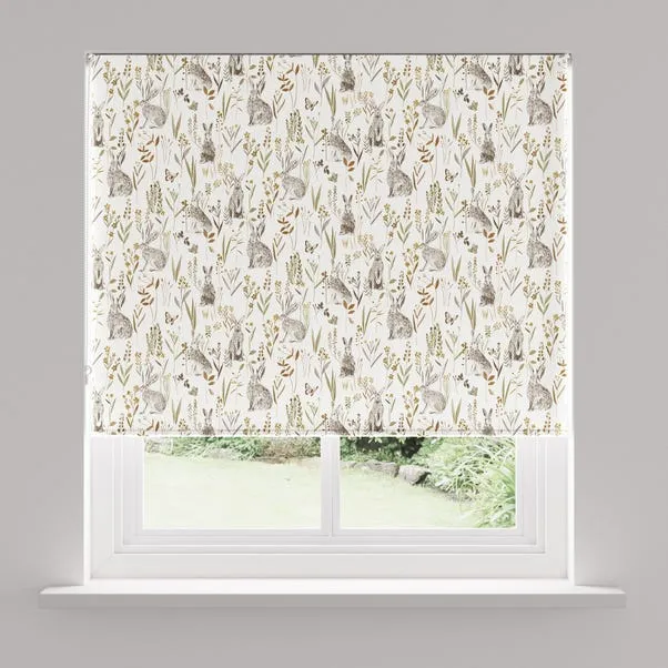 Natural-coloured Hares blackout roller blind with floral and animal design. Full light-blocking fabric enhances privacy, supplied with all fixings for easy installation and timeless style.