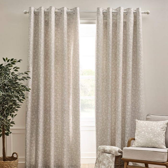 Bring natural elegance to your interiors with these floral eyelet curtains in a calming neutral tone. Crafted from a soft polycotton blend, they provide a gentle touch while being durable. Fully lined for light control and privacy, they combine style with practicality.