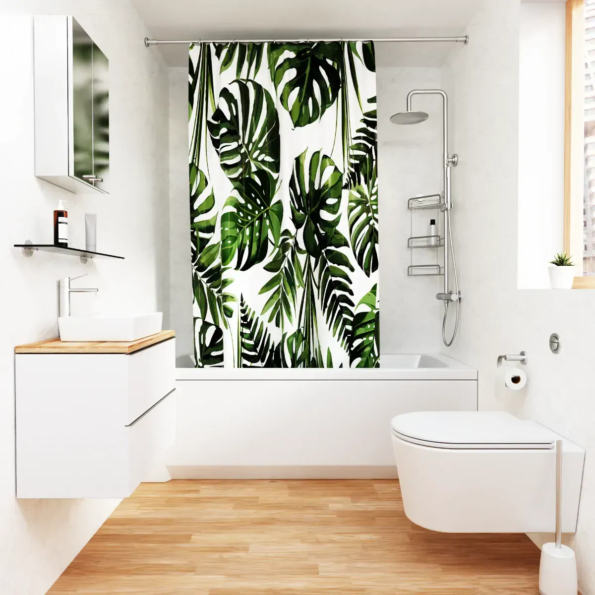 Bring a touch of nature to your bathroom with the green botanical leaves curtain. Crafted from water-repellent Proseal® fabric, it combines style, durability, and easy maintenance. Corrosion-resistant eyelets and a weighted hem ensure a neat, cling-free shower experience.