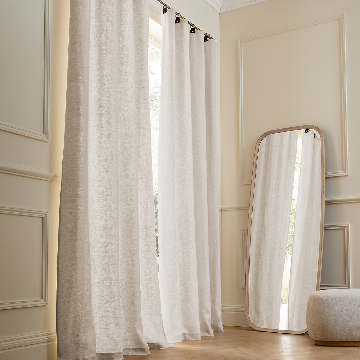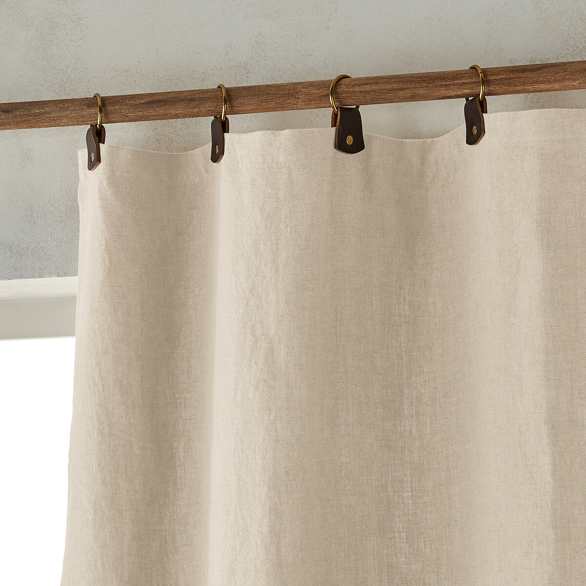 Add a refined, natural touch to your space with this lined washed linen eyelet curtain. Featuring a subtle crumpled texture, it offers a relaxed yet elegant look. Faux leather loops with metal rings enhance durability while ensuring smooth hanging.