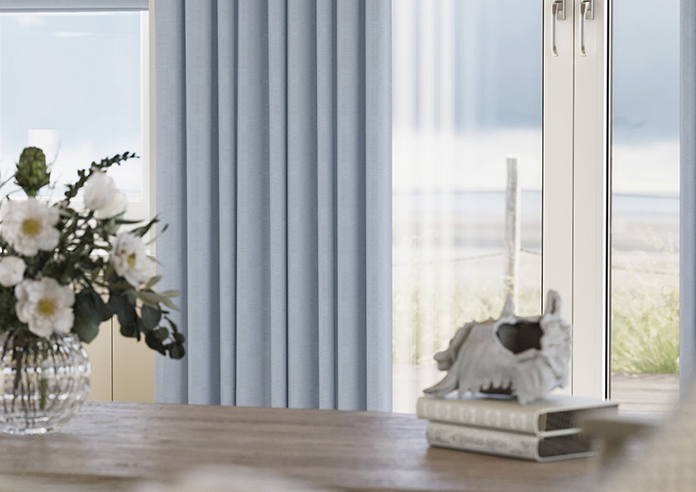 Light and airy faux silk curtains in a soft sky blue tone, designed to brighten any space with a gentle sheen. Fully made to measure with lining options, perfect for fresh, modern, or coastal interiors.
